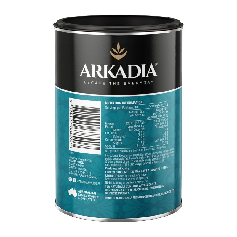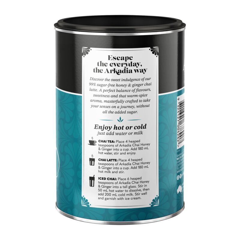 Realza tus momentos de chai latte con la mezcla de miel y jengibre de Arkadia Beverages, elaborada por expertos, que te ofrece un sabor placentero sin renunciar a nada.